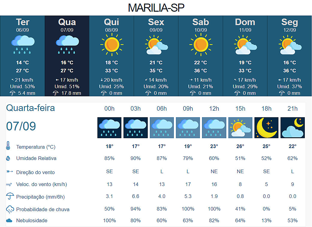Segundo o Ipmet (Instituto de Pesquisas Meteorológicas), no caso de Marília a probabilidade é de 100% de chuva às 9h (horário do desfile) mas com uma quantidade considerada pequena: 5,5 mm.