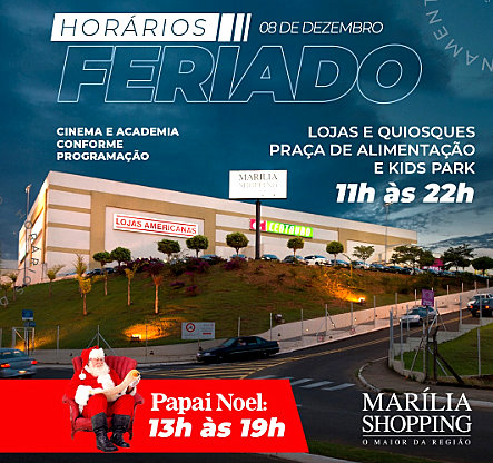O Marília Shopping funcionará em horário especial nesta quinta-feira (dia 8), feriado municipal. O funcionamento das lojas, quiosques e Praça de Alimentação será das 11h às 22h.