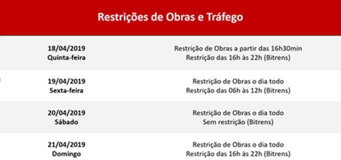 As restrições incluem proibição do trânsito de caminhões cegonha, bitrens e operações Pare e Siga, nos seguintes horários: