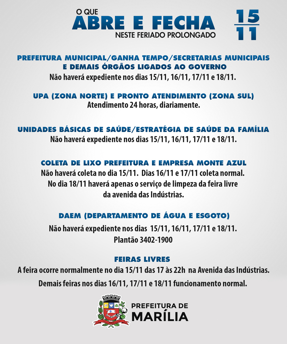 As repartições públicas municipais de Marília (como Prefeitura, DAEM, Emdurb e Secretarias, além da Câmara) vão "emendar" o fim de semana, devido ao feriado desta quinta-feira (15). A coleta de lixo será suspensa somente nesta quinta, sendo realizada normalmente nos demais dias. Já as feiras livres terão programação normal.