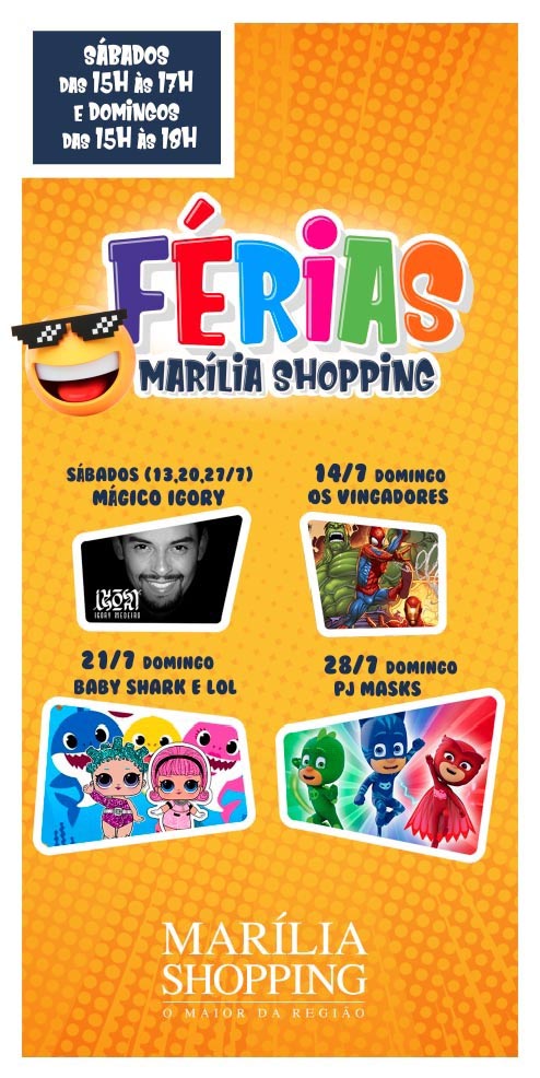 Para ninguém ficar em casa e aproveitar ainda mais as férias, o Marília Shopping preparou opções diferenciadas em lazer e entretenimento para que as famílias possam se divertir a valer. A programação começa neste sábado à tarde e todas as atividades são gratuitas.