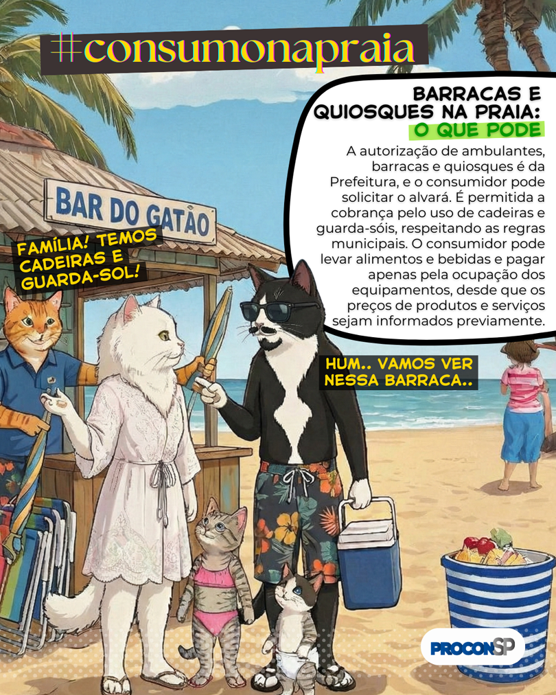 Pensando nisso, o Procon de São Paulo lançou a campanha #ConsumoNaPraia, com um folder informativo voltado à orientação dos consumidores que frequentam praias nesta temporada.