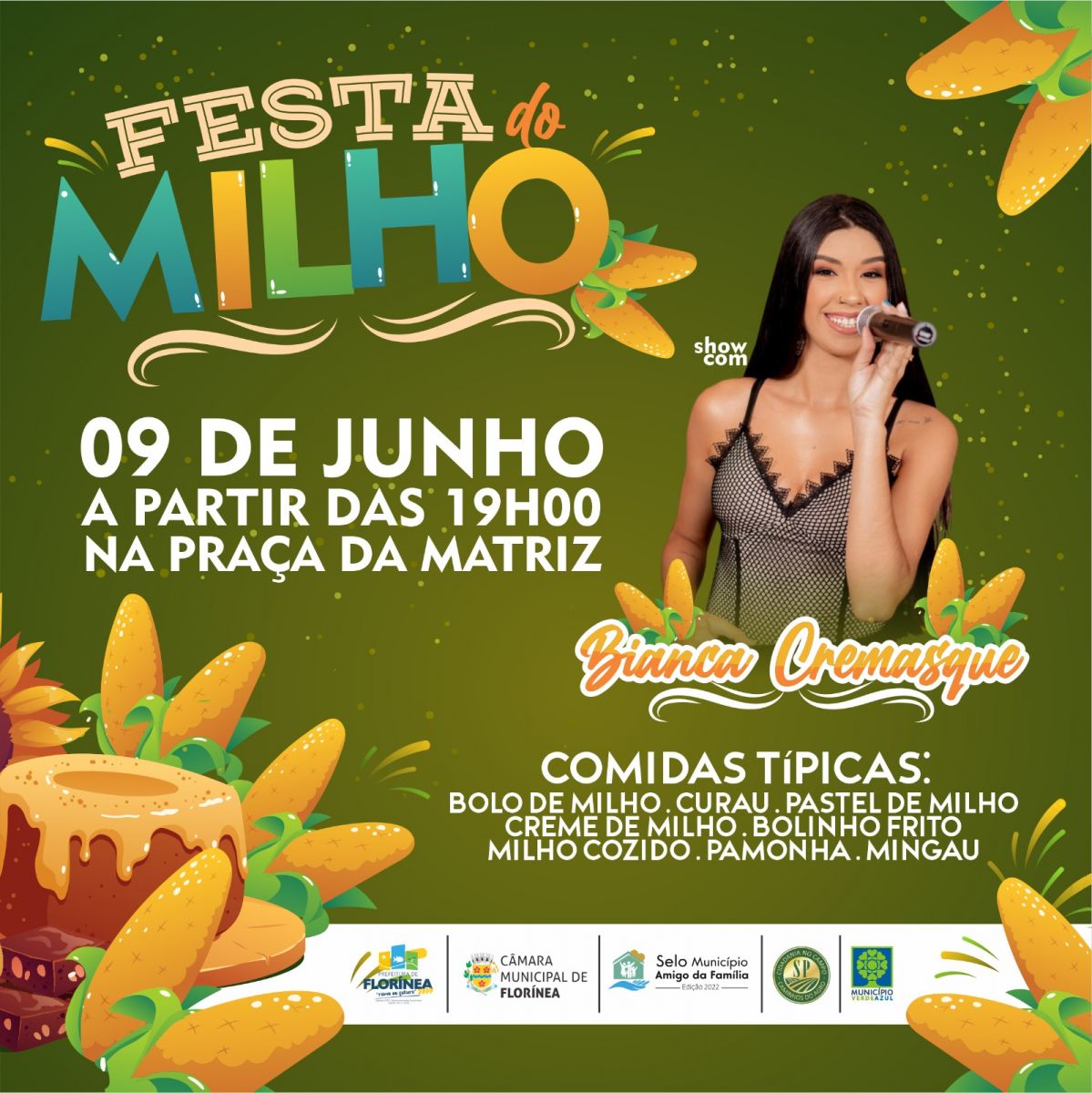 O evento começa às 19h30, na Praça da Matriz, com diversas atrações às famílias, como brinquedos infláveis, apresentação musical da cantora Bianca Cremasque, além de muitos pratos típicos derivados do milho.