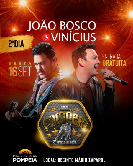 A animação da arena ficará por conta de Bruno e Marrone. A festa é muito aguardada por Pompeia e região já que se tornou muito tradicional e pela qualidade do evento.