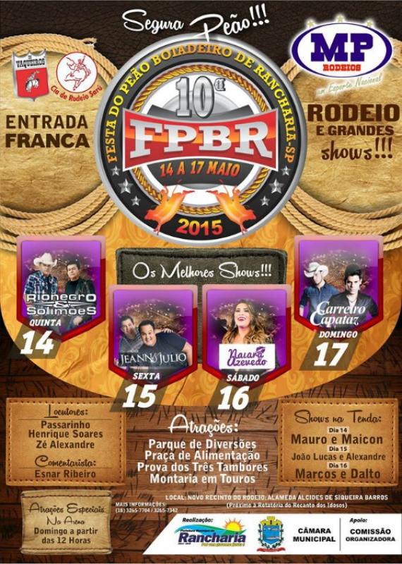 Começa na noite desta quinta (14) em Rancharia (118 km de Marília), a 10ª Festa do Peão de Rancharia, com entrada franca. O já tradicional evento prossegue até o domingo (17), com realização da Prefeitura e Câmara, bem como apoio da Comissão Organizadora.