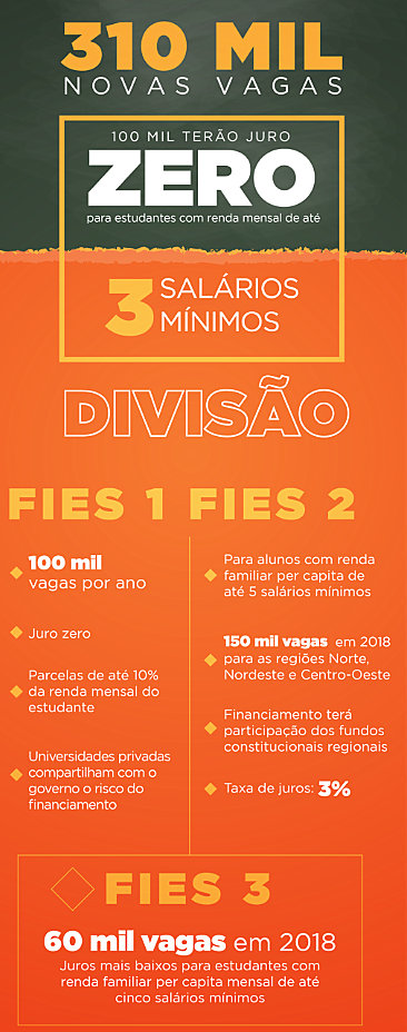 Novo - A partir de 2018, o Novo Fundo de Financiamento Estudantil será dividido em três modalidades. Na primeira, o Fies funcionará com um fundo garantidor com recursos da União e ofertará 100 mil vagas por ano, com juros zero para os estudantes que tiverem uma renda per capita mensal familiar de três salários mínimos.