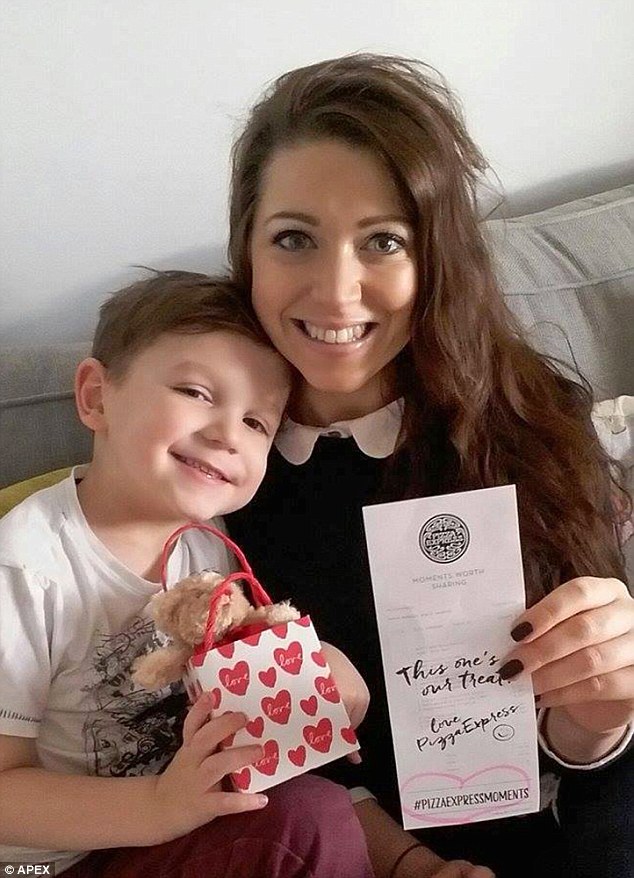 Após uma deliciosa refeição de três pratos, fomos pagar. A garçonete, em lágrimas, que tinha visto o nosso jantar especial nos ofereceu uma refeição como cortesia do Pizza Express. Este gesto extremamente gentil me deixou chorando de felicidade e segurando meu filho com alegria pura!
