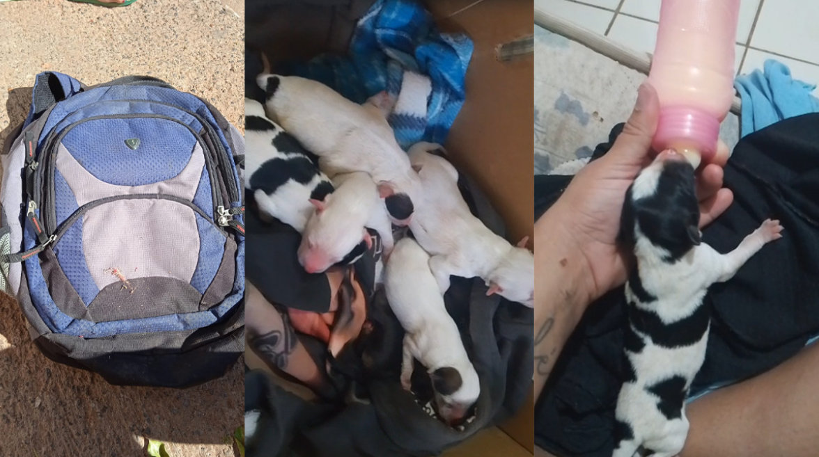 "Na mochila tinham nove filhotes, sendo que dois já estavam mortos. Na hora não pensei duas vezes, pegamos todos e voltamos correndo pra casa", acrescentou.