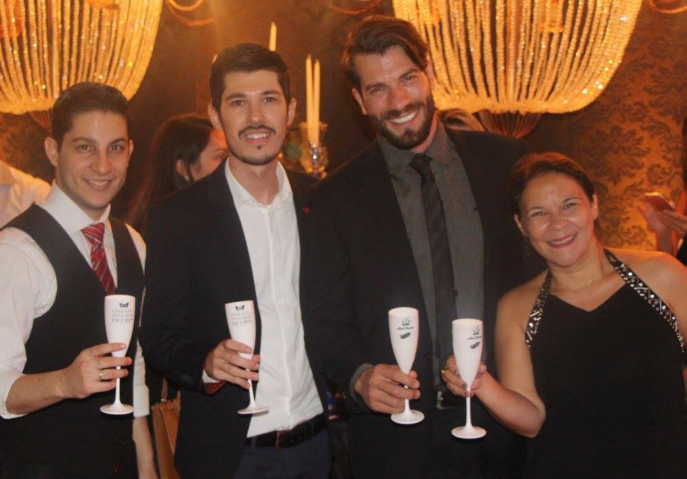 caracterizados pelo casal central do filme que serviram espumante aos convidados.