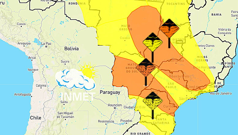 Há risco também de queda de granizo principalmente na Grande São Paulo, nas regiões de Campinas, de São Carlos, São José do Rio Preto, Ribeirão Preto, Franca, Barretos, Sorocaba, Bauru, Vale do Paraíba, Itapeva e Vale do Ribeira.