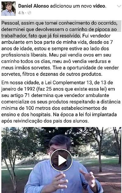 DEFESA - O prefeito Daniel Alonso gravou um vídeo em que explica o motivo da ação dos fiscais e vai apurar se houve abuso de autoridade. Explicou a existência da legislação em vigor e que o pipoqueiro já teria sido notificado seis vezes sobre a proibição de permanecer naquele local, pois estava na faixa dos 100 metros.