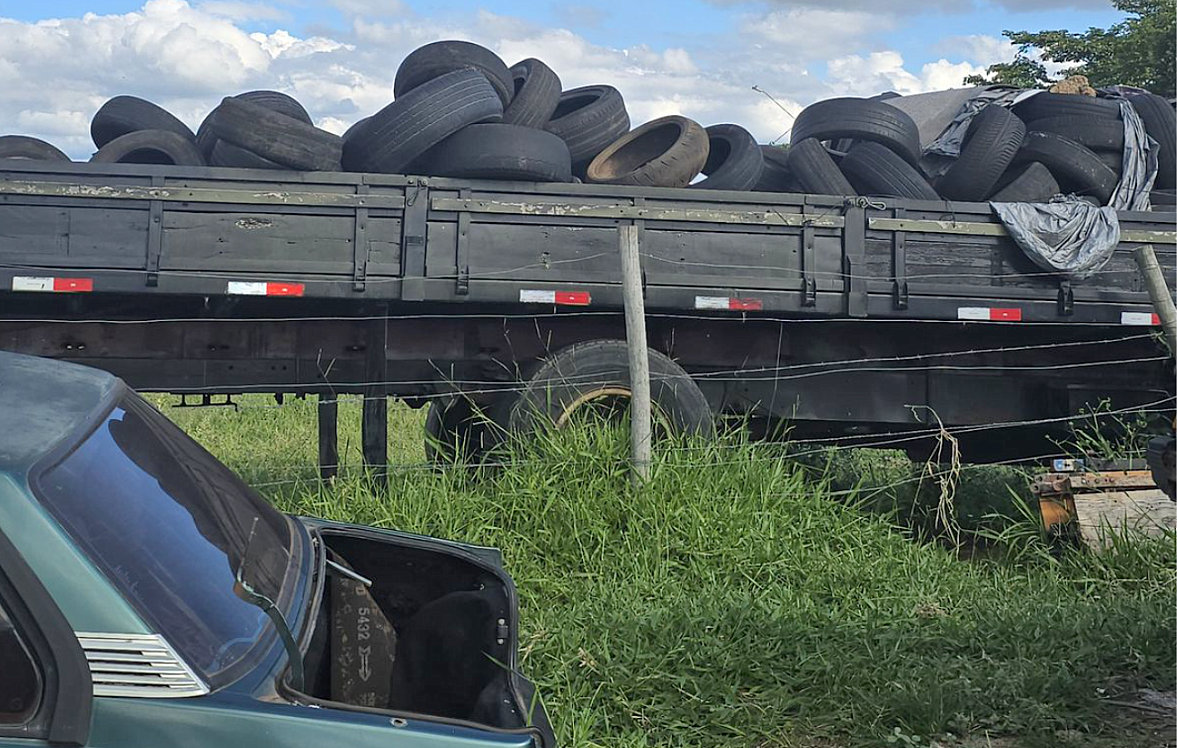 No local, os fiscais constataram que havia um caminhão carregado com pneus armazenados de forma inadequada, a céu aberto e com acúmulo de água, condição que favorece a proliferação do mosquito transmissor da dengue.