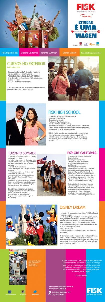 A Escola de Idiomas Fisk de Marília apresenta nesta quarta-feira (07) um novo modelo de serviços de INTERCÂMBIO que envolve a viagem, curso, hospedagem e muita orientação. De acordo com a diretora, Silvia Sampaio, "oferecemos todos os serviços que você precisa desde a escolha e reserva de escolas, passagens aéreas, seguro de viagem, vistos, documentação, hospedagem, transporte e orientação de viagem". Silvia também é responsável pelo programa de intercâmbio na escola.
