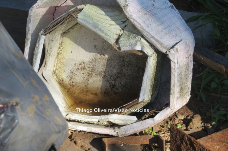 Em uma caixa de papelão com água parada, focos de larvas da dengue foram avistadas. Em uma lata de tinta, ainda no quintal da construção, água parada e suja também foi encontrada.