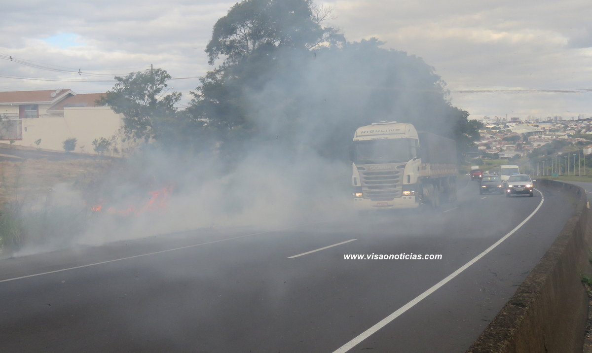 Vegetação queimando ao lado da via expressa Sampaio Vidal.