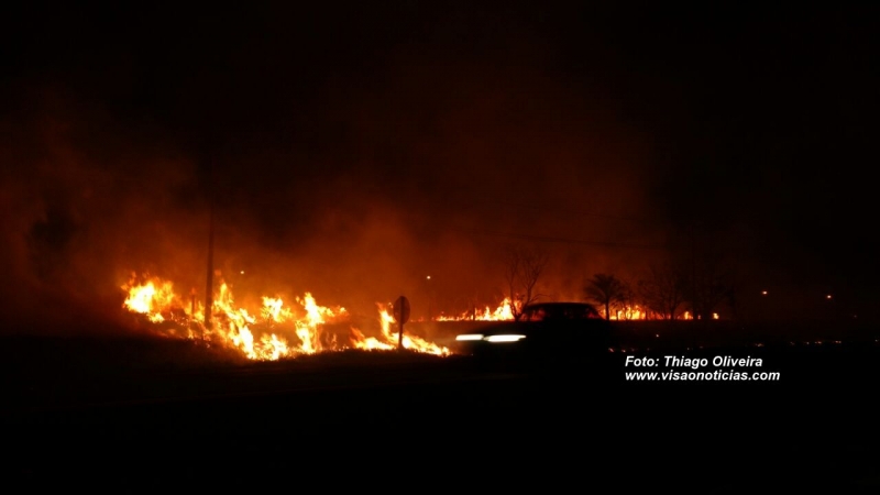 e o distrito de Padre Nóbrega, próximo ao posto Ecológico. As chamas chegaram às margens da pista, colocando em risco a segurança dos motoristas.