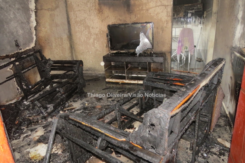 As chamas destruíram todo o cômodo, e ainda se alastraram para a cozinha, também a destruindo.