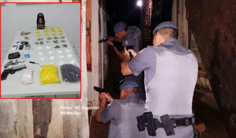No interior de um barraco foram localizados um revólver calibre 32, um simulacro de pistola, uma mixa para furtar motos, aproximadamente 100 porções de maconha, 150 pinos de crack, 150 pinos de cocaína e 1000 pinos vazios.