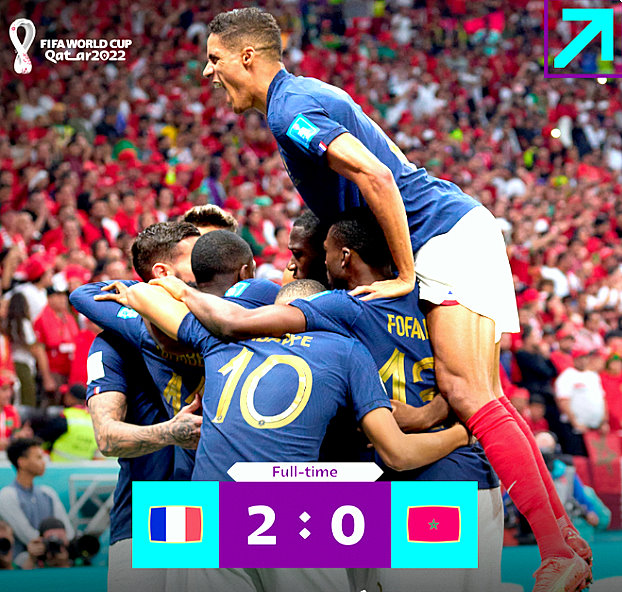 A França fez valer a sua condição de favorita e derrotou o Marrocos por 2 a 0 para alcançar a final da Copa do Catar. Após triunfar, na tarde desta quarta-feira (14) no Estádio Al Bayt, a seleção francesa concentra suas atenções na equipe da Argentina, sua adversária na grande decisão do próximo domingo (18), oportunidade na qual será proclamado um novo tricampeão do Mundial de seleções da Fifa.