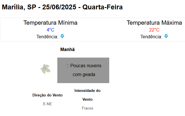 Com previsão de mínima de 4?°C na madrugada desta quarta-feira em Marília (segundo o IPMet - Centro de Meteorologia de Bauru), a temperatura deve voltar a subir a partir de quinta-feira quando a mínima já sobe para 14?°C. Mas, deve ficar abaixo dos 20?°C até o começo de julho. Já as temperaturas máximas neste período devem chegar no máximo a 26?°C, o que já era esperado para o inverno.