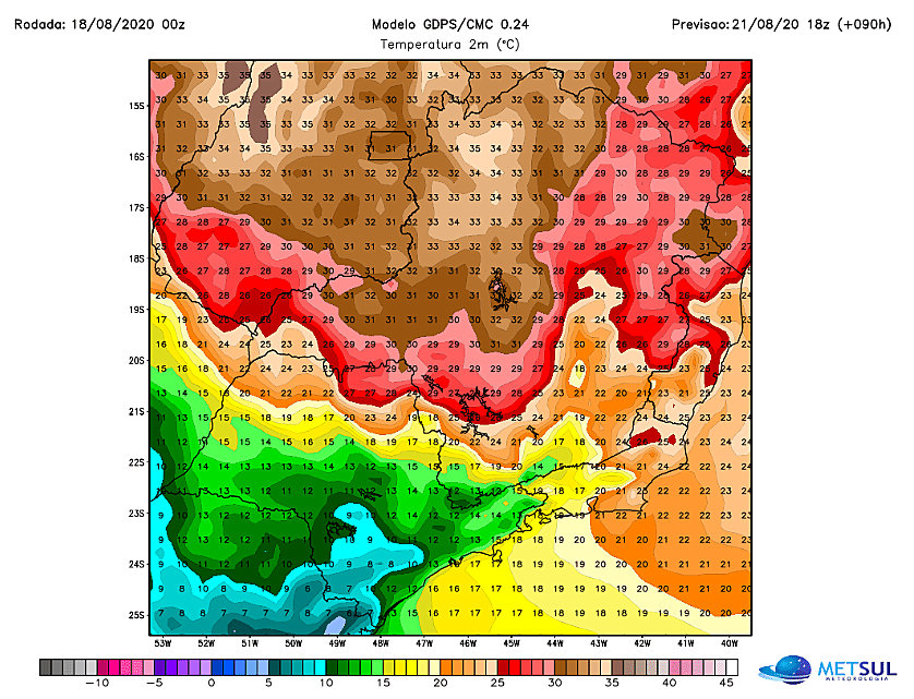 Será um enorme contraste com o Norte do estado de São Paulo que no mesmo horário terá temperatura muitíssimo mais alta.