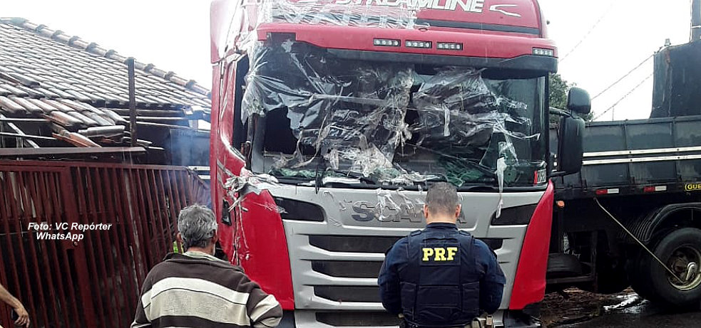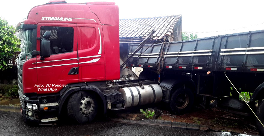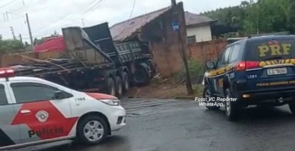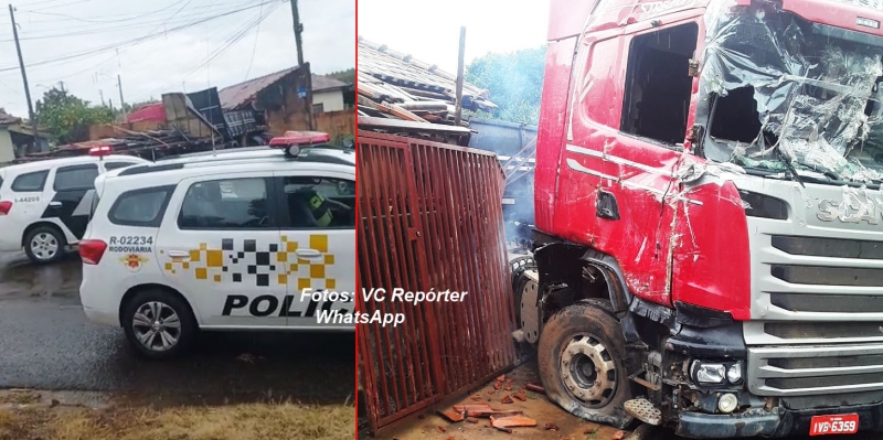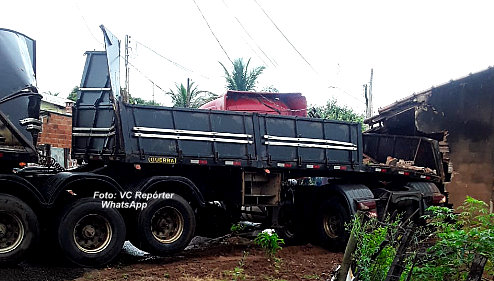 Já no distrito, acabou perdendo o controle, bateu no muro e quase invadiu uma casa. Com pneus furados, o motorista abandonou a carreta e fugiu.