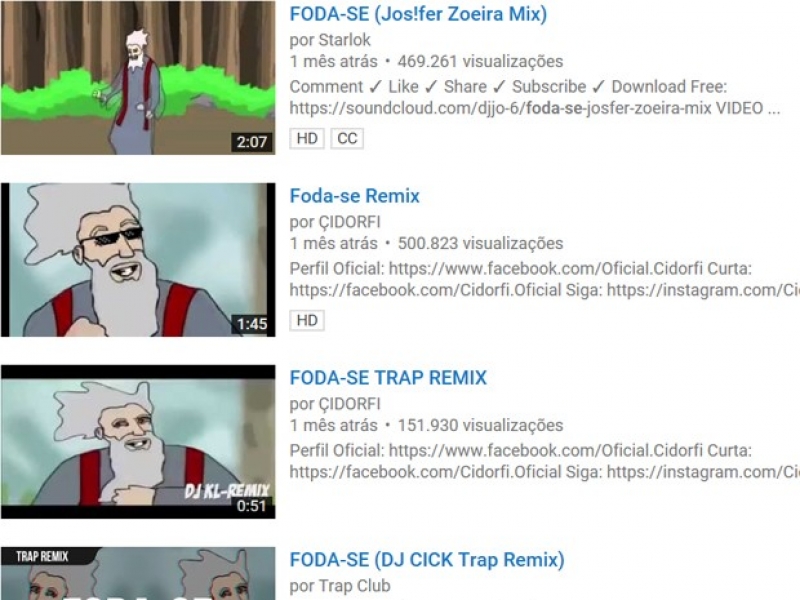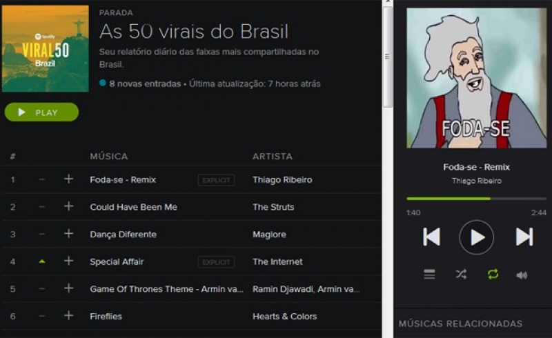 Um remix da "Dança do foda-se" está em 1º lugar no ranking "50 virais no Brasil" do Spotify. A parada mostra as faixas mais compartilhadas por ouvintes brasileiros do serviço de streaming. A versão feita pelo produtor pernambucano Thiago Ribeiro é um dos vários remixes espalhados na internet nas útimas semanas.
