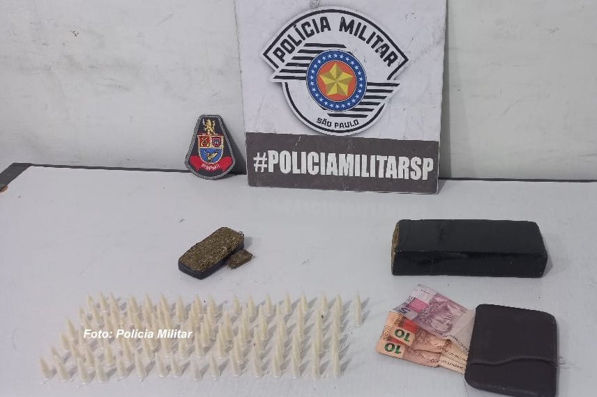 Dentro do veículo foram localizados pouco mais de meio quilo de maconha (um tablete) e 98 pinos de crak.