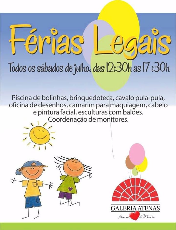 Pensando nisso, a Galeria Atenas realiza a partir deste sábado a promoção "Férias Legais". Todos os sábados do mês de julho, as crianças terão muitas atrações, no horário das 12h30 às 17h30.