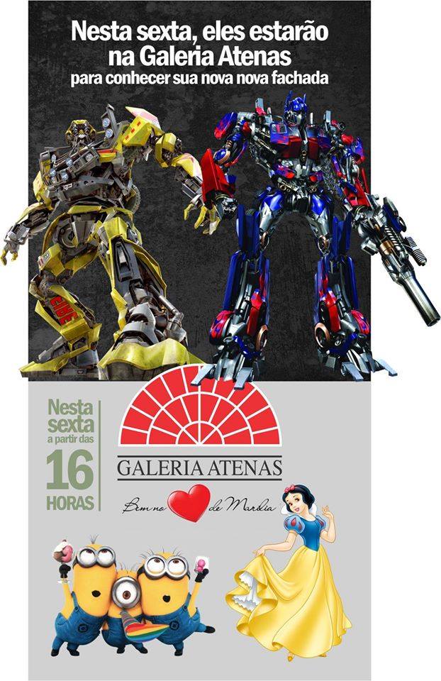 Como outubro é o mês das crianças, com a entrega da revitalização externa, a Galeria Atenas programou atividades para a garotada nesta sexta, a partir das 16h, com os Transformers, Miníos e Branca de Neve.