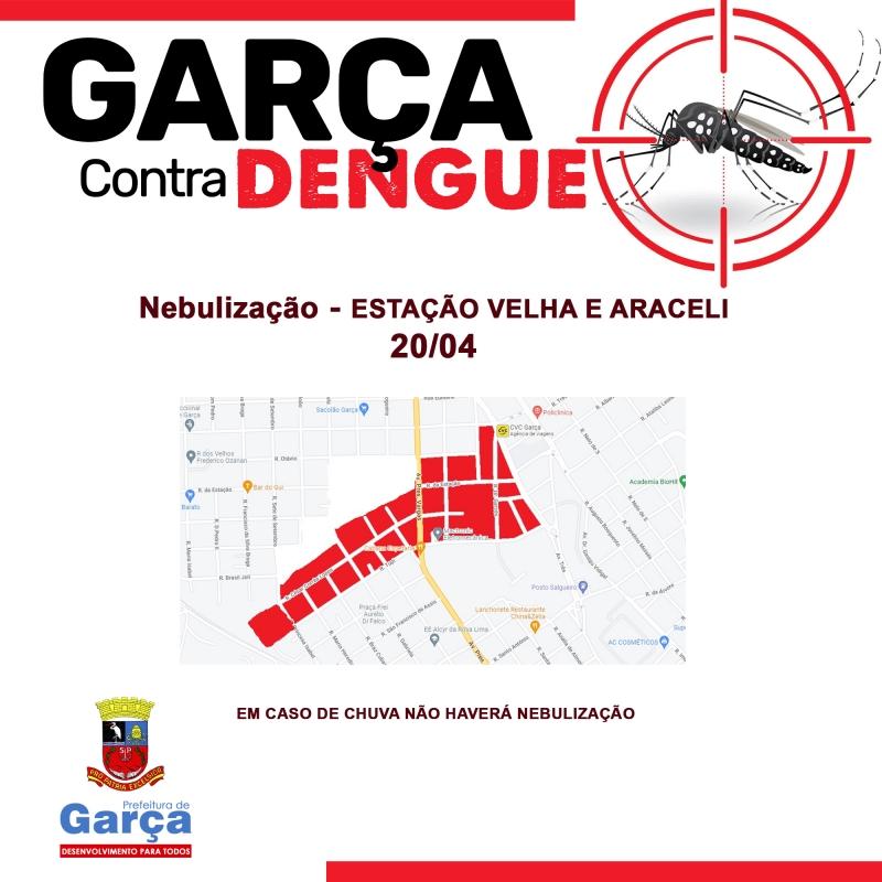 Com 799 casos positivos, 3.699 casos suspeitos, 4.616 notificações e 118 casos negativos até o momento, a Prefeitura de Garça continua com as nebulizações em toda a cidade para combater o mosquito Aedes aegypti, que também transmite a zika, febre chikungunya e febre amarela.