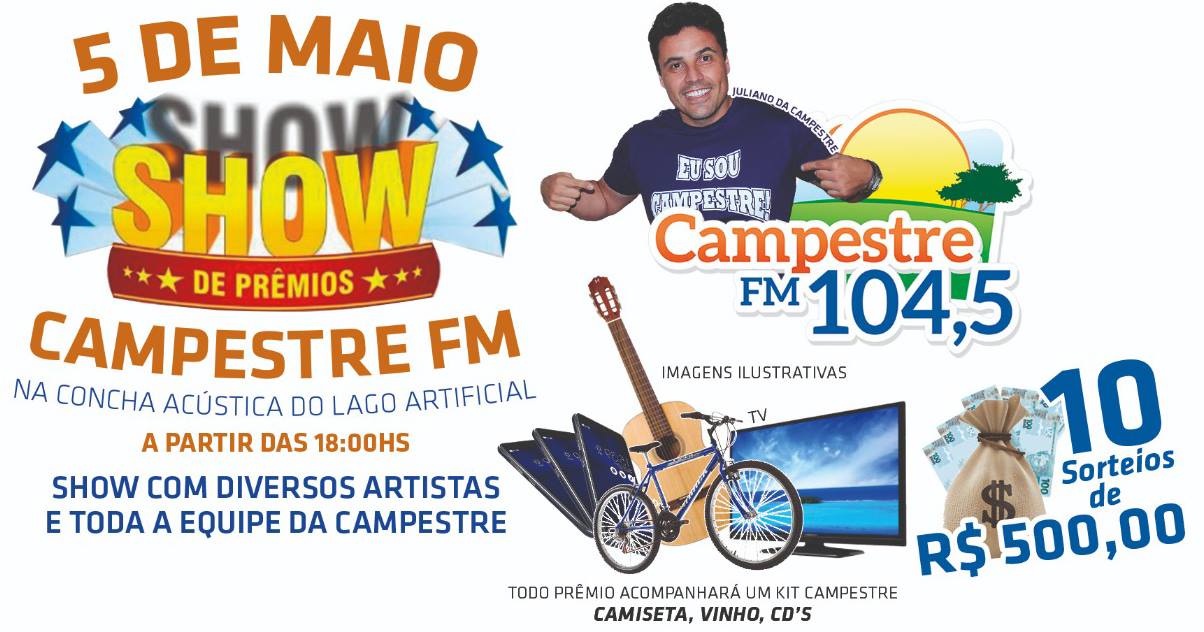 As comemorações no sábado se encerram com o Show de Prêmios promovido pela rádio Campestre FM, a partir das 18 horas, no Lago Municipal JK Willians. Serão sorteados dez prêmios de 500 reais, além de smartphones e aparelhos televisores.