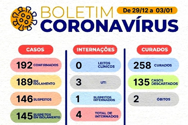 De acordo com o balanço semanal (período de 29 de dezembro a 3 de janeiro), foram confirmados em Garça 192 novos casos de Covid-19, com três pessoas internadas, sendo duas delas em leito de UTI.