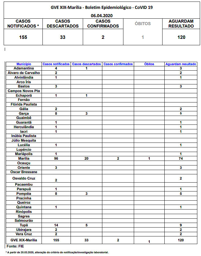 Até agora, foram 155 notificações, com 33 casos dxescartados, duas confirmações (ambas de Marília - não está incluído o caso de Garça porquer está fazendo parte do boletim desta terça-feira), uma morte e 120 exames aguardando resultados.
