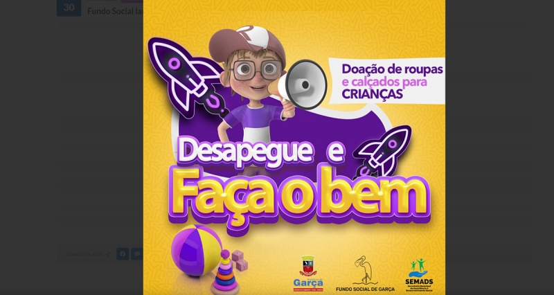 O Fundo Social de Garça e Secretaria de Assistência e Desenvolvimento Social lançaram a campanha "Desapegue e faça o bem". O objetivo é receber doações de roupas e calçados para crianças.
