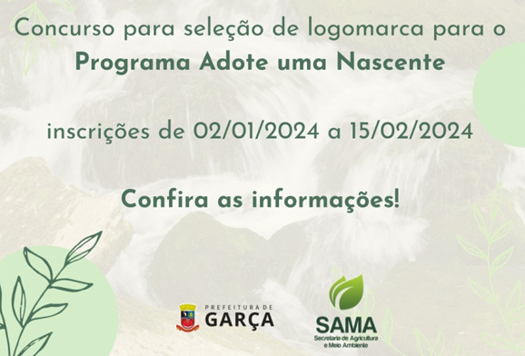 A Prefeitura de Garça recebe até o dia 15 de fevereiro as inscrições dos interessados em participar do concurso que vai escolher a logomarca que vai identificar o Programa “Adote uma Nascente”. O vencedor receberá premiação em dinheiro (R$ 5 mil).