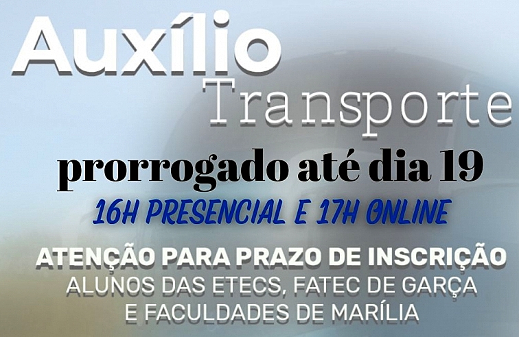 A Secretaria de Desenvolvimento Econômico e Turismo de Garça prorrogou até esta quinta-feira o prazo para o Programa Auxílio Transporte 2023 à estudantes, com vagas para escolas e faculdades em Marília.