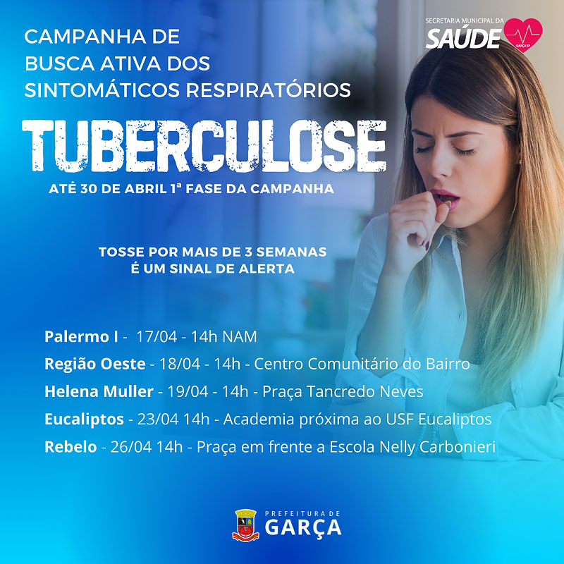 A Prefeitura de Garça realizará até o dia 30 de abril a primeira fase da campanha para identificar e tratar precocemente a tuberculose entre os moradores no município.