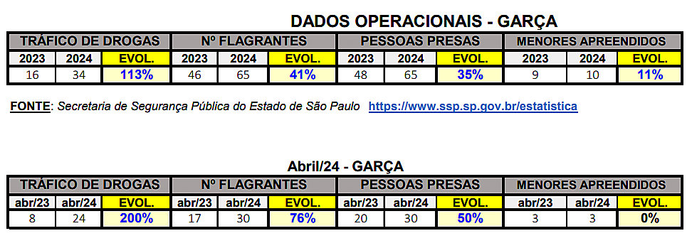 Os dados foram divulgados nesta tarde pela Polícia Militar e são referentes ao mês de abril/2024 em comparação com o mesmo período do ano passado.