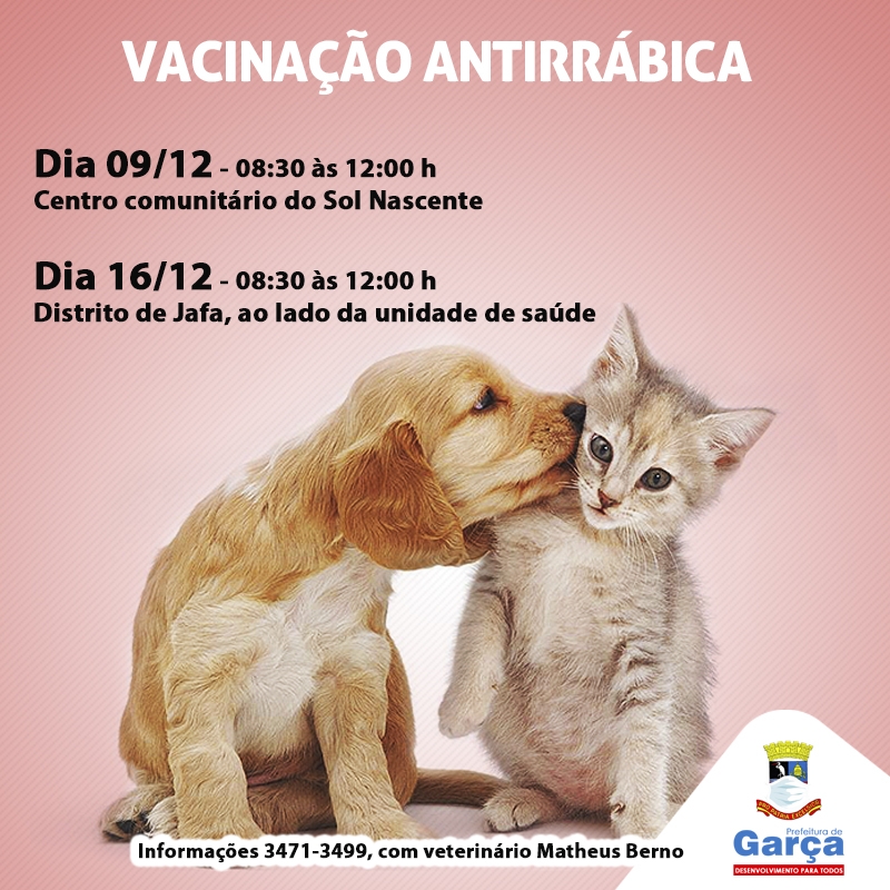 A Secretaria de Agricultura e Meio Ambiente de Garça preparou mais duas datas para a vacinação antirrábica, que protege cachorros e gatos da raiva.