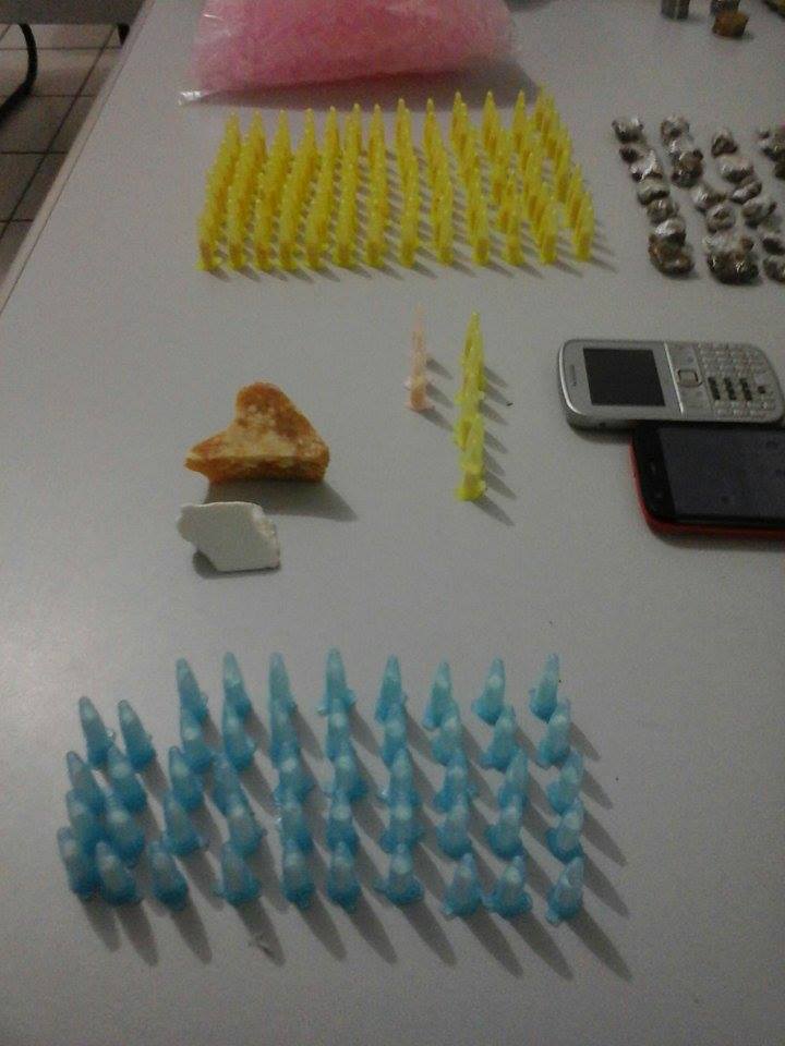 Os policiais receberam informação de que uma casa era usada para venda de drogas e depararam com duas mulheres. Foram feitas revistas nas casas e, em uma delas, foram localizados: 140 pinos com crack, 48 pinos com cocaína, 38 porções de maconha, R$ 296 em dinheiro e uma balança de precisão.