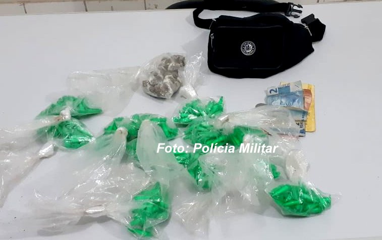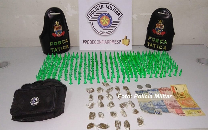 No interior de uma sacola que ele trazia, foram apreendidos 311 pinos de cocaína e 26 porções maconha. Já numa pochete estava 35 reais provenientes do tráfico de drogas.