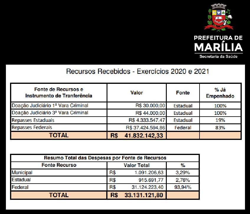 A Prefeitura de Marília ainda tem um saldo de R$ 8,7 milhões para investimentos no combate à Covid-19, de um total de R$ 41,8 milhões arrecadados.