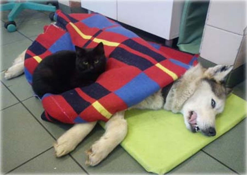 O bichano foi tratado de uma infecção respiratória e depois que se recuperou não foi mais embora. Hoje ele mostra sua gratidão e retribui o carinho que recebeu fazendo o mesmo com os outros animais que chegam ao local.