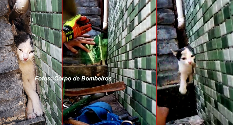 A informação é de um gatinho de apenas quatro meses, de nome "Tiquinho" havia ficado preso entre o muro e tijolos de uma churrasqueira.