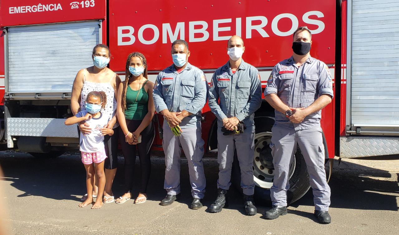 Família ao lado da equipe dos Bombeiros que fez o salvamento.