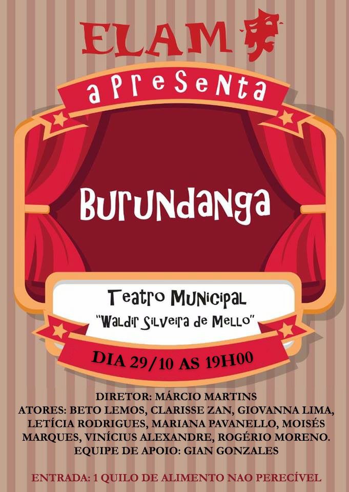 Este é um resumo da peça teatral Burundanga que estará sendo apresentado pelo grupo ELAM (Escola Livre de Artes de Marilia) neste domingo (29) às 19h00, Teatro Municipal de Marília. A entrada é um quilo de alimento não perecível.