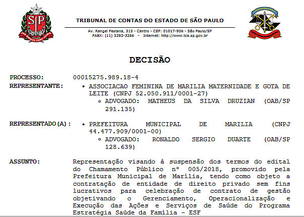 A direção da Maternidade Gota de Leite de Marília conseguiu suspender o chamamento público da Prefeitura para contratação de OS (Organização Social) que ficará responsável pelas ações do Programa ESF (Estratégia de Saúde da Família). A entidade entrou com uma representação no Tribunal de Contas que concedeu liminar determinando à Prefeitura faça correçõesno edital.
