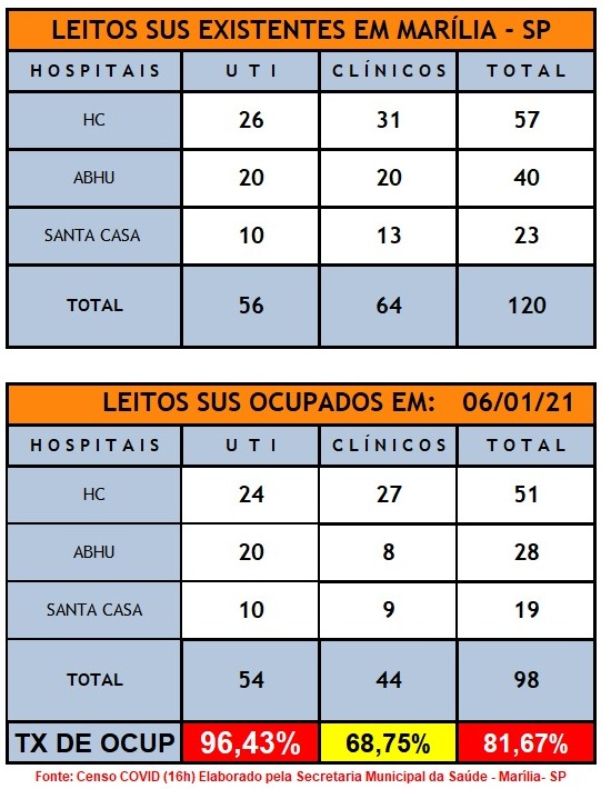 Os hospitais de Marília, por exemplo, chegaram a ocupação de praticamente 100% de UTI e só não houve transferência de pacientes para outras cidades, na madrugada de terça-feira, porque durante o dia seguinte ocorreu uma "pequena queda" nessa taça de ocupação.