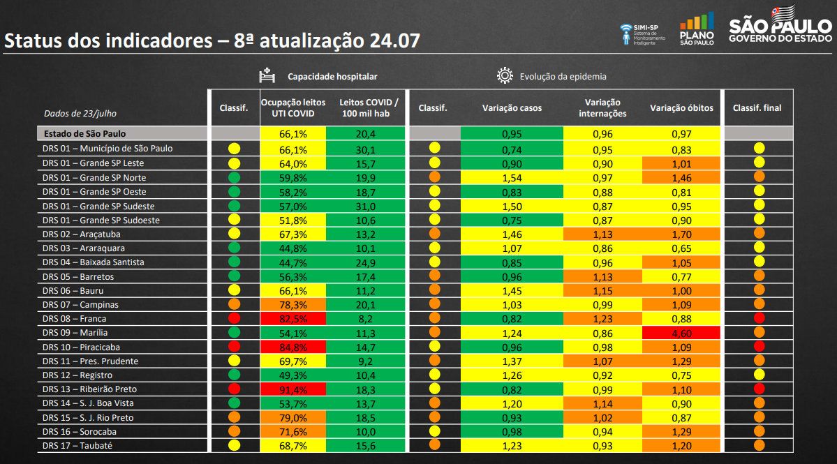 Sem regressão de fase em nenhuma região e com quarentena prorrogada até o dia 10 de agosto, o Governador João Doria anunciou nesta sexta-feira (24) a oitava atualização do Plano São Paulo de retomada econômica e enfrentamento do coronavírus.